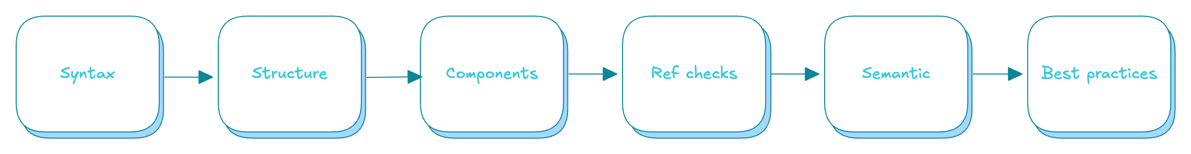 The validation runs as a 6 stage pipeline. Each stage builds on the results of the previous one, and here's what each stage catches. Later stages are skipped if earlier ones produce errors, which avoids cascading false positives.