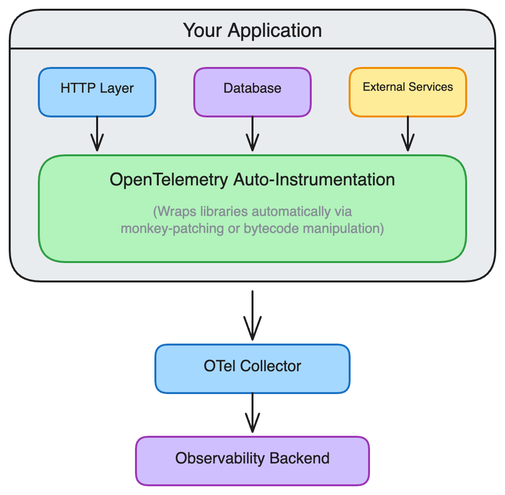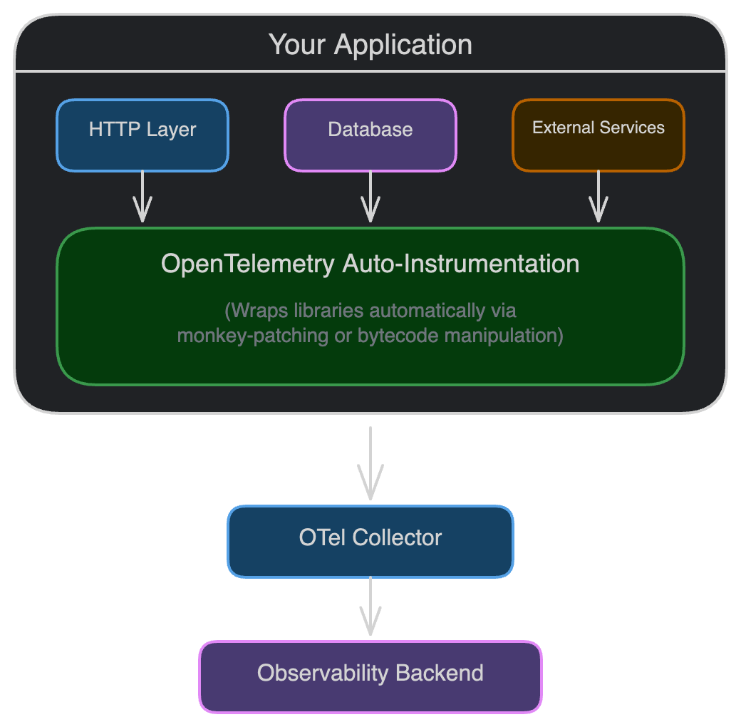 Auto-instrumentation provides zero-code observability by automatically capturing traces, metrics, and logs from your application and its dependencies. This is the fastest way to get started with OpenTelemetry.